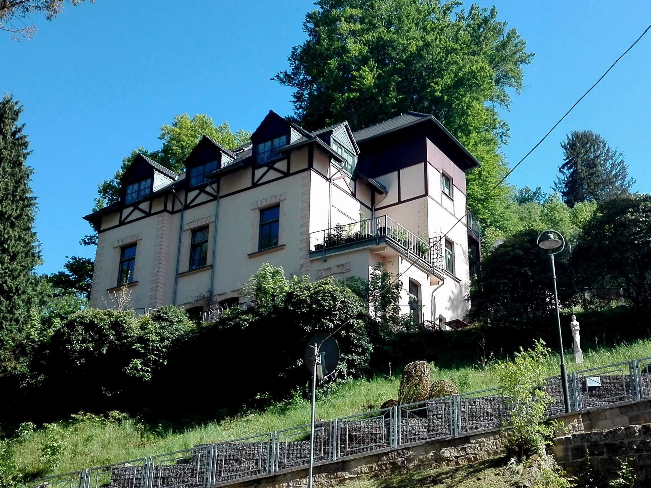 2geräumige Ferienwohnungen – stilvoll eingerichtet. Kunst ziert die Wände und lädt zum Betrachten ein. Skulpturen von Jürgen Oppermann vor dem Haus weisen am Hang den Weg.